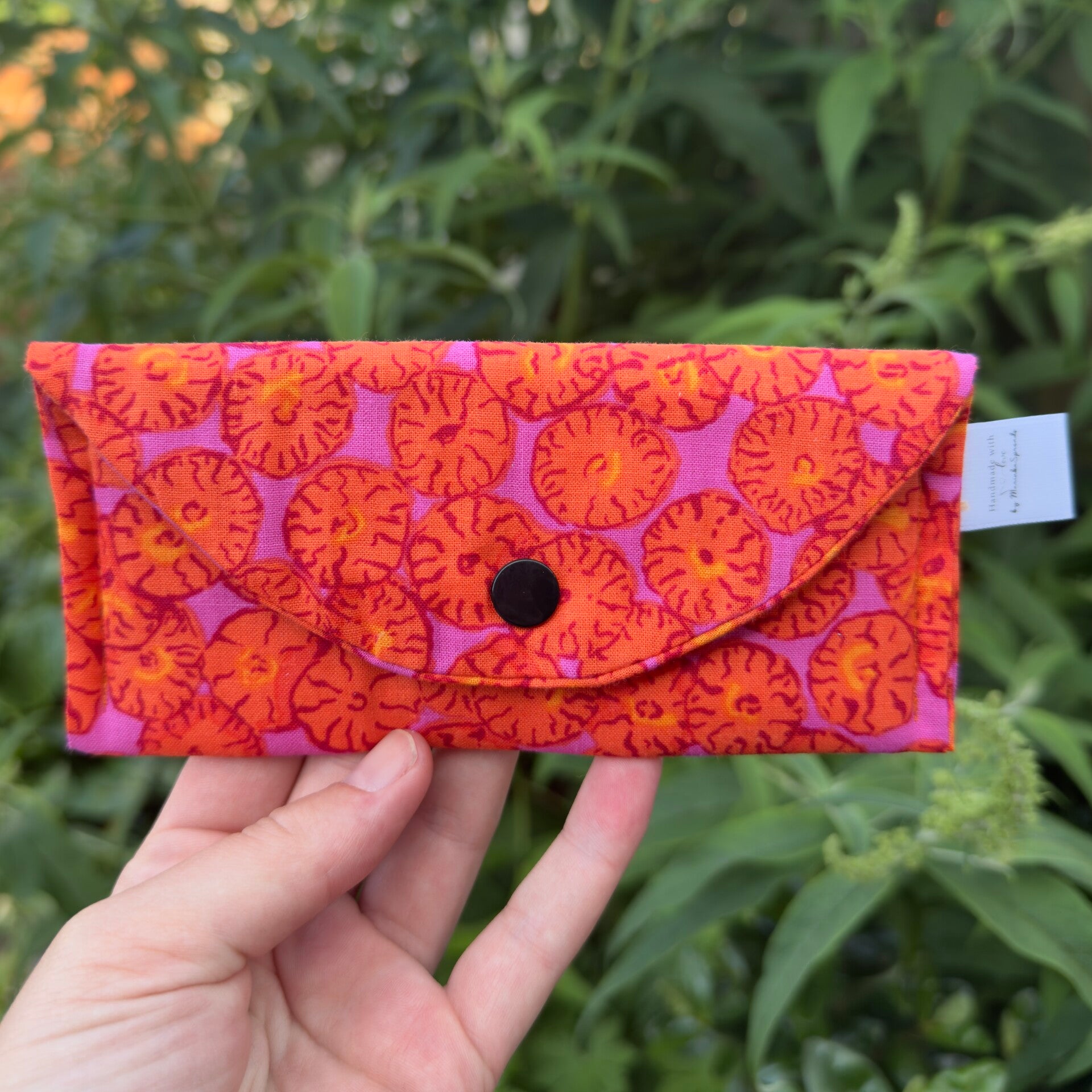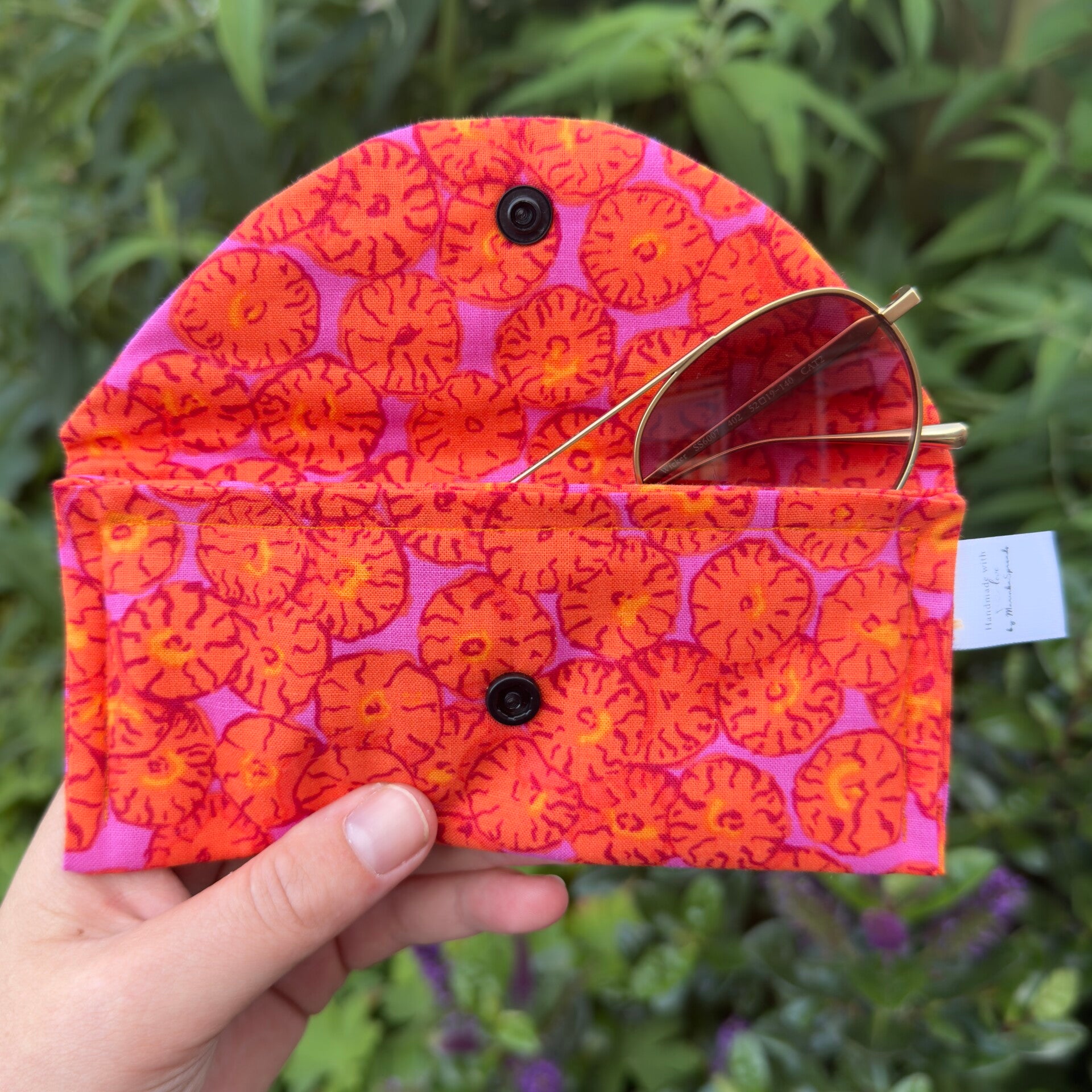 Bewaar je (zonne)bril veilig én in stijl met dit handgemaakte hoesje. Gemaakt van een stevige, zachte stof met een vrolijke print en drukknoop om de hoes dicht te doen.